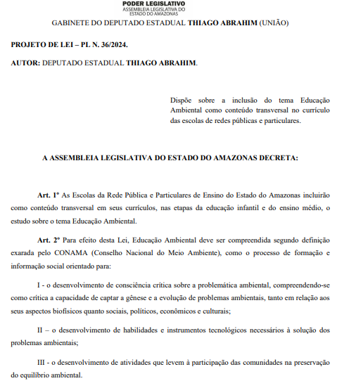 - PL 36/2024: dispõe sobre a inclusão do tema Educação Ambiental como conteúdo transversal no currículo das escolas de redes públicas e particulares;