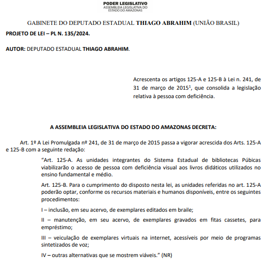 - PL 135/2024: trata do acesso de pessoas com deficiência visual a livros didáticos nas bibliotecas públicas.