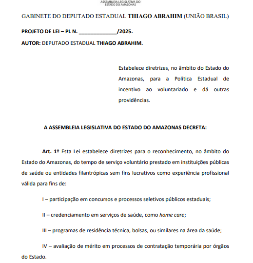 - PL 697/2025: estabelece diretrizes, no âmbito do Estado do Amazonas, para a Política Estadual de incentivo ao voluntariado e dá outras providências;