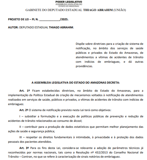 - PL 741/2025: dispõe sobre diretrizes para a criação de sistema de notificação, no âmbito dos serviços de saúde públicos e privados do Estado do Amazonas, de atendimentos a vítimas de acidentes de trânsito com indícios de embriaguez, e dá outras providências;