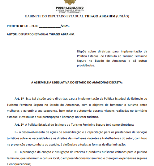 - PL 818/2025: dispõe sobre diretrizes para implementação da Política Estadual de Estímulo ao Turismo Feminino Seguro no Estado do Amazonas e dá outras providências;