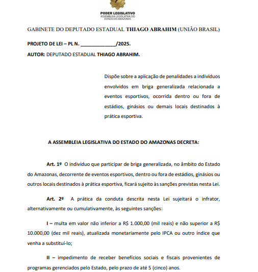 - PL 862/2025: dispõe sobre a aplicação de penalidades a indivíduos envolvidos em briga generalizada relacionada a eventos esportivos, ocorrida dentro ou fora de estádios, ginásios ou demais locais destinados à prática esportiva;