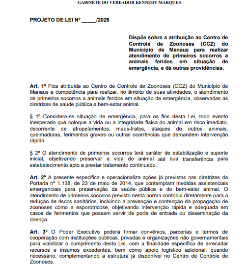 Animais feridos encontrados nas ruas de Manaus podem passar a receber atendimento emergencial do poder público. Um projeto de lei apresentado pelo vereador Kennedy Marques (MDB) na Câmara Municipal de Manaus (CMM) propõe que o Centro de Controle de Zoonoses (CCZ) realize primeiros socorros em situações de urgência envolvendo animais domésticos ou silvestres.