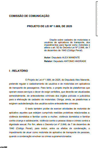 O texto aprovado é um substitutivo do relator, deputado Antonio Andrade, ao Projeto de Lei 1689/25, de autoria do deputado Alex Manente. A versão inicial previa que usuários dos aplicativos apresentassem autodeclaração sobre antecedentes criminais, ponto retirado por Andrade. Segundo ele, a exigência criaria um cenário inédito no país e poderia expor consumidores a riscos penais sem qualquer estrutura estatal de verificação, além de estimular a informalidade.