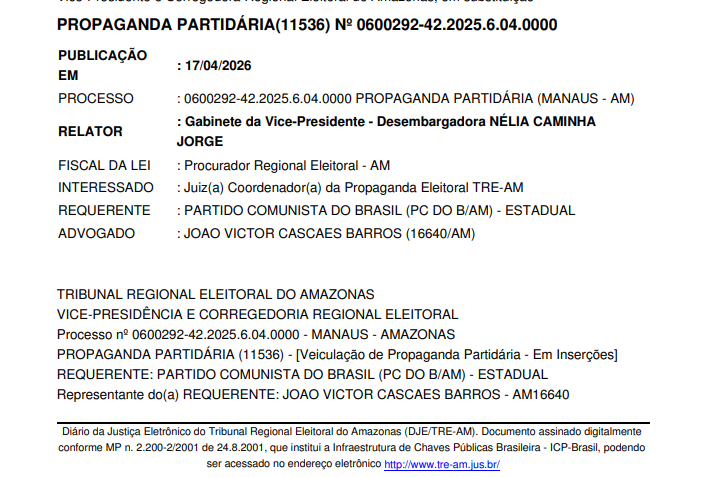 O Tribunal Regional Eleitoral do Amazonas (TRE-AM) decidiu negar o pedido do Partido Comunista do Brasil (PCdoB) para veiculação de propaganda partidária gratuita no primeiro semestre de 2026. A Corte manteve o entendimento de que o requerimento foi apresentado fora do prazo previsto na legislação eleitoral.