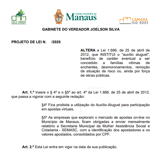 A proposta, de autoria do vereador Joelson Silva (Avante), acrescenta dois novos parágrafos ao artigo 4º da legislação vigente, estabelecendo novas regras para o uso do benefício. De acordo com o texto, fica expressamente proibida a utilização do Auxílio-Aluguel para participação em apostas virtuais.