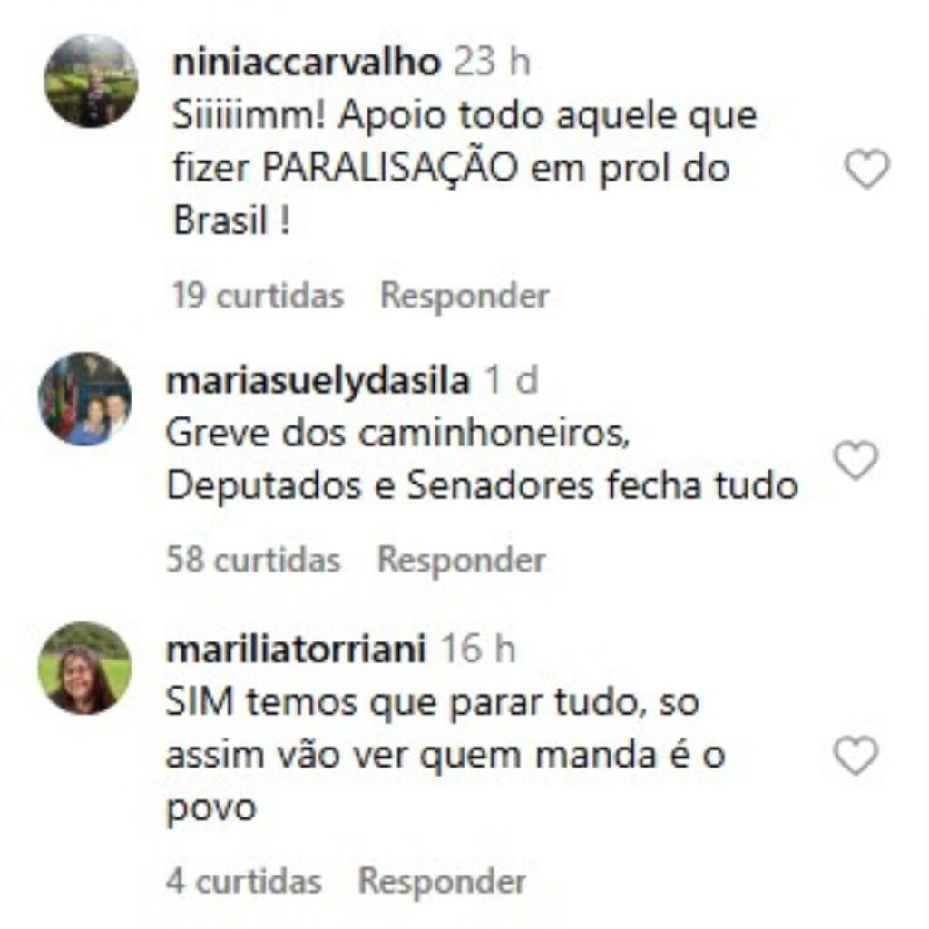 Na publicação, diversos perfis de apoiadores do ex-presidente apoiam as paralisações: “Siiiiimm! Apoio todo aquele que fizer PARALISAÇÃO em prol do Brasil”, declarou uma usuária. Outra também apoiou os atos: “Greve dos caminhoneiros, Deputados e Senadores fecha tudo”. “SIM temos que parar tudo, so assim vão ver quem manda é o povo”, diz outro comentário.