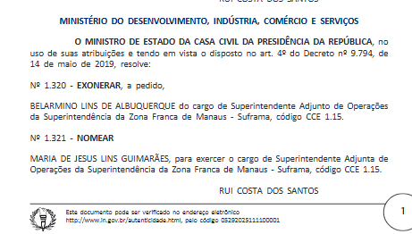 O documento aponta que Belão foi exonerado do cargo de superintendente adjunto de Operações da Superintendência da Zona Franca de Manaus (Suframa). Para a função, foi nomeada Maria de Jesus Lins Guimarães, irmã do ex-deputado.