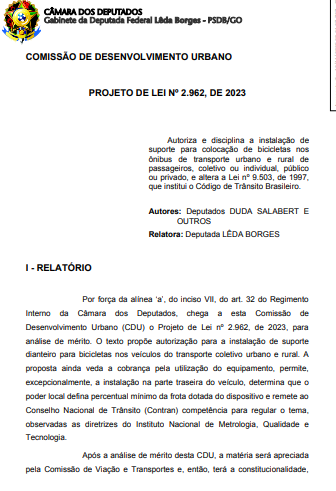 A Comissão de Desenvolvimento Urbano da Câmara dos Deputados aprovou, em dezembro de 2025, uma proposta que autoriza a instalação de suportes para o transporte de bicicletas em ônibus e micro-ônibus do transporte coletivo. O texto altera o Código de Trânsito Brasileiro, a Política Nacional de Mobilidade Urbana e o Programa Bicicleta Brasil.