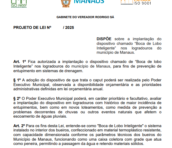 Um Projeto de Lei de autoria do vereador Rodrigo Sá (PP) foi protocolado na Câmara Municipal de Manaus (CMM), permitindo a implantação das chamadas “bocas de lobo inteligentes” nos logradouros públicos de Manaus. O objetivo é prevenir entupimentos nos sistemas de drenagem e reduzir os alagamentos causados pelo acúmulo de lixo nas redes pluviais.