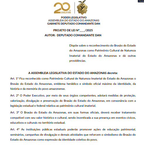 O brasão do Estado do Amazonas poderá ser oficialmente reconhecido como Patrimônio Cultural de Natureza Imaterial do estado. O reconhecimento está previsto em projeto de lei (PL) de autoria do deputado estadual Comandante Dan (Republicanos), aprovado pela Assembleia Legislativa e encaminhado à sanção governamental.