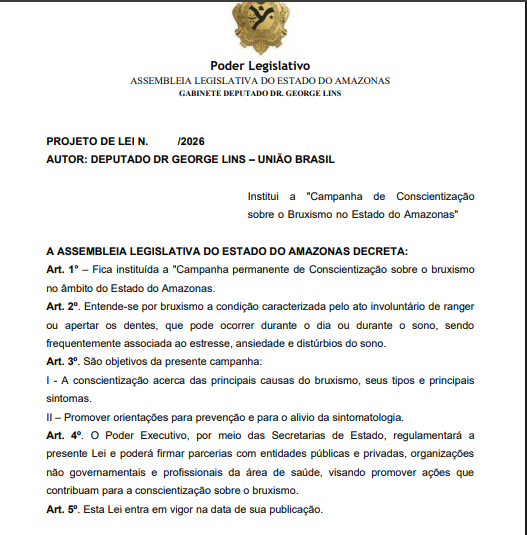 A iniciativa é do deputado estadual Dr. George Lins (União Brasil) e busca ampliar o conhecimento da população sobre a condição, que pode ocorrer tanto durante o dia quanto durante o sono e costuma estar associada ao estresse, à ansiedade e a distúrbios do sono. Na justificativa da proposta, o parlamentar destaca que muitas pessoas convivem com o bruxismo sem saber, já que os sintomas costumam se manifestar durante o sono.