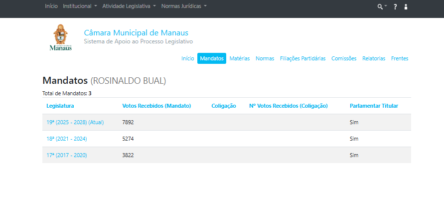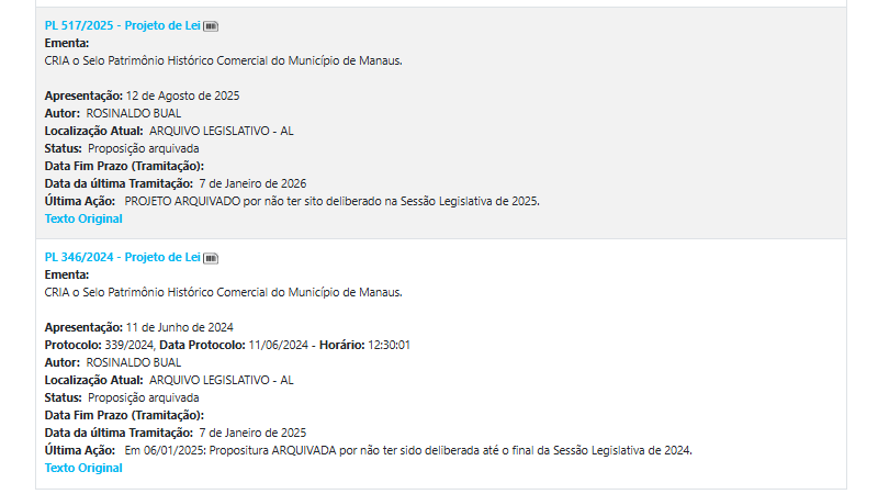Segundo registros do Sistema de Apoio ao Processo Legislativo (SAPL) da Câmara Municipal de Manaus, Rosinaldo Bual foi autor de 11 projetos de lei no ano de 2025 e coautor de outros 7 projetos no mesmo período.