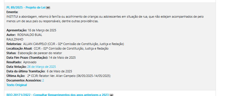 Projeto que estabelece que crianças e adolescentes encontrados em situação de rua, sem acompanhantes legais, sejam abordados por profissionais do serviço social para avaliação e encaminhamento apropriado. A matéria foi incluída na pauta de deliberação e segue para análise nas comissões.