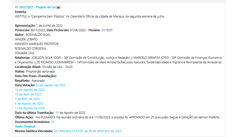 Embora seja originado de PL de anos anteriores, a proposta de criar no calendário municipal a “Campanha Sem Plástico” para promover redução de uso de descartáveis e conscientização ambiental estava em análise na CMM no ano de 2025.