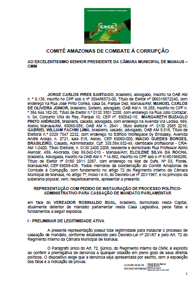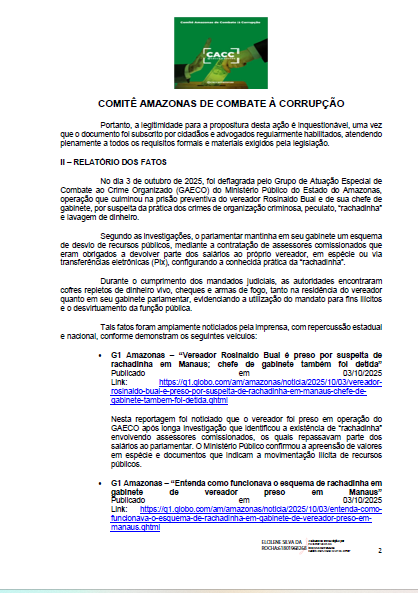 Assinado por seis advogados que integram a coordenação do Comitê, o pedido tem como base as investigações conduzidas pelo Gaeco (Grupo de Atuação Especial de Combate ao Crime Organizado) do Ministério Público do Amazonas (MPAM), que apontam a existência de um esquema de devolução de parte dos salários de assessores comissionados do gabinete de Bual — prática conhecida como “rachadinha”.