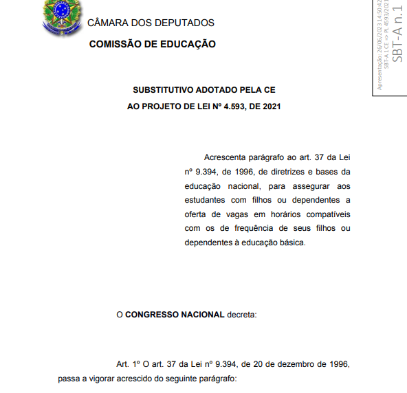 O texto tem como objetivo permitir que pais e filhos estudem em horários compatíveis, evitando que as responsabilidades familiares se tornem um obstáculo à permanência escolar. A regra valerá tanto para a educação regular quanto para a modalidade de Educação de Jovens e Adultos (EJA).