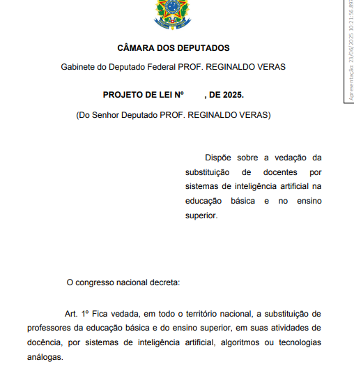 “A inteligência artificial é um avanço extraordinário, mas na educação ela deve servir ao professor e ao aluno, e não eliminar postos de trabalho ou desumanizar o processo de aprendizagem”, afirmou o parlamentar.