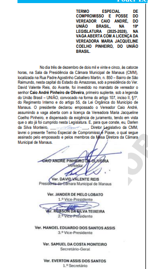 A Câmara Municipal de Manaus (CMM) oficializou a posse do vereador Caio André Pinheiro de Oliveira, suplente do União Brasil, para ocupar a vaga aberta com a licença da vereadora Professora Jacqueline. O Termo Especial de Compromisso e Posse informa que o parlamentar reassumiu o mandato na tarde de 3 de dezembro, conforme publicação no Diário Oficial do Legislativo Municipal desta quinta-feira (4/12).