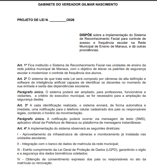 Um projeto de lei em tramitação na Câmara Municipal de Manaus (CMM) propõe a implantação de câmeras com inteligência artificial nas escolas da rede pública da capital. A iniciativa, de autoria do vereador Gilmar Nascimento (Avante), prevê o uso de reconhecimento facial para identificar alunos e comunicar pais e responsáveis em tempo real sobre a movimentação dentro das unidades de ensino.