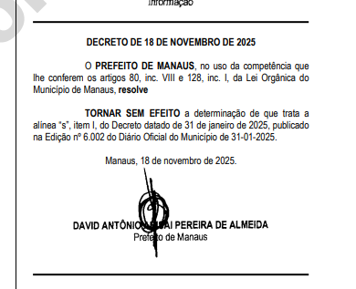 O prefeito de Manaus, David Almeida, revogou o ponto facultativo que estava previsto para esta sexta-feira (21/11), um dia após o feriado da Consciência Negra. A determinação consta na edição nº 6.198 do Diário Oficial do Município (DOM), publicada na terça-feira (18/11).