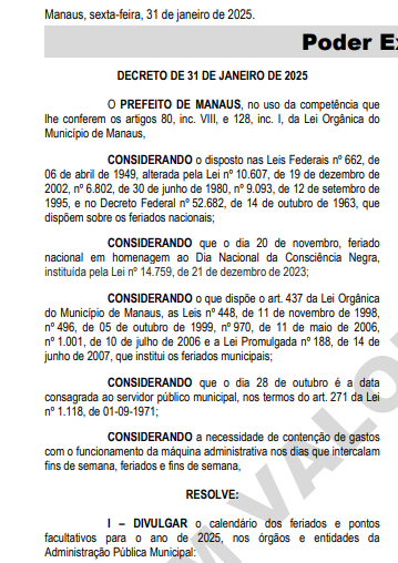 David Almeida não apresentou justificativa para a suspensão da folga. Ele cita, no entanto, que a medida está amparada pela Lei Orgânica do Município. “O prefeito de Manaus, no uso da competência que lhe conferem os artigos 80, inc. VIII, e 128, inc. I, da Lei Orgânica do Município de Manaus”, diz o documento.