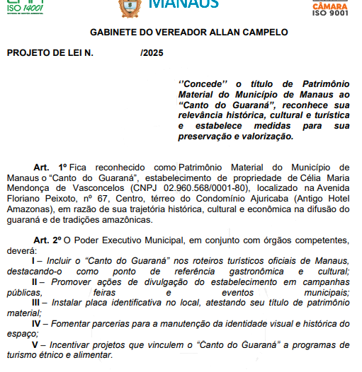O vereador Allan Campelo (Podemos) apresentou um Projeto de Lei (PL) na Câmara Municipal de Manaus (CMM) que reconhece o tradicional “Canto do Guaraná” como Patrimônio Material do Município de Manaus, em razão de sua trajetória histórica, cultural e econômica na difusão do guaraná e das tradições amazônicas.