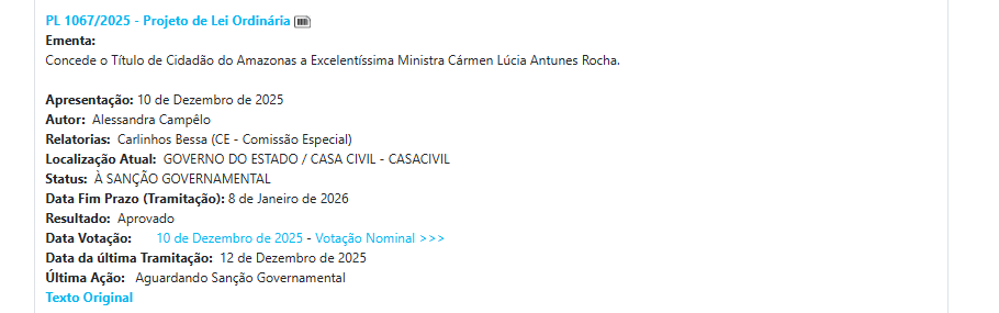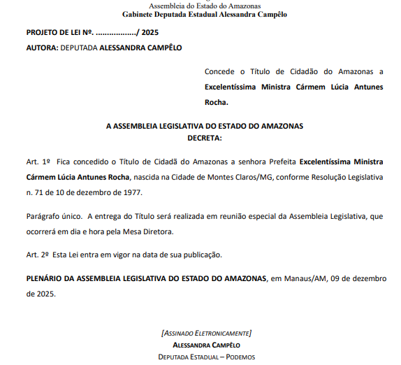 A Assembleia Legislativa do Amazonas (Aleam) aprovou projeto de lei (PL) de autoria da deputada estadual Alessandra Campelo (Podemos) que concede o Título de Cidadã do Amazonas à ministra do Supremo Tribunal Federal, Cármen Lúcia Antunes Rocha. A matéria segue agora para sanção governamental.
