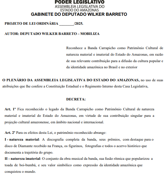 O deputado estadual Wilker Barreto (Mobiliza) apresentou um Projeto de Lei (PL) na Assembleia Legislativa do Estado do Amazonas (Aleam), que busca reconhecer oficialmente o legado da Banda Carrapicho como Patrimônio Cultural de natureza material e imaterial do Estado do Amazonas, em razão da contribuição do grupo para a projeção da cultura amazonense no Brasil e no exterior.