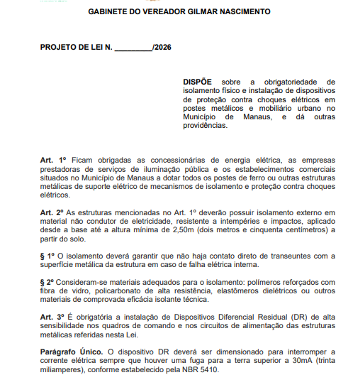 A morte do adolescente Samuel Vinícius Lima Gama, no ano de 2025, após sofrer uma descarga elétrica em um poste em Manaus, motivou a apresentação de um projeto de lei na Câmara Municipal que busca reforçar a segurança em estruturas elétricas espalhadas pela cidade. A proposta é de autoria do vereador Gilmar Nascimento (Avante) e está em tramitação.