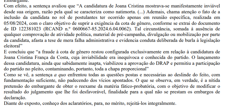 Na sentença, o juiz destacou que a candidatura de Joana Cristina era “manifestamente inviável desde sua origem”, caracterizando-se como “natimorta”. Ele apontou que a inclusão do nome da candidata na ata partidária ocorreu apenas em 5 de agosto de 2024 — data próxima ao prazo final de registro — “com o claro objetivo de suprir a exigência da cota de gênero”.
