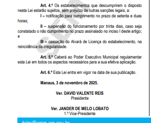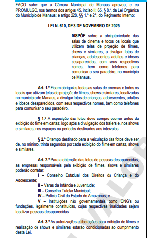 A Câmara Municipal de Manaus (CMM) promulgou a Lei nº 610, de 3 de novembro de 2025, que torna obrigatória a exibição de fotos de pessoas desaparecidas em salas de cinema, shows e outros locais que utilizem telas de projeção na capital amazonense.