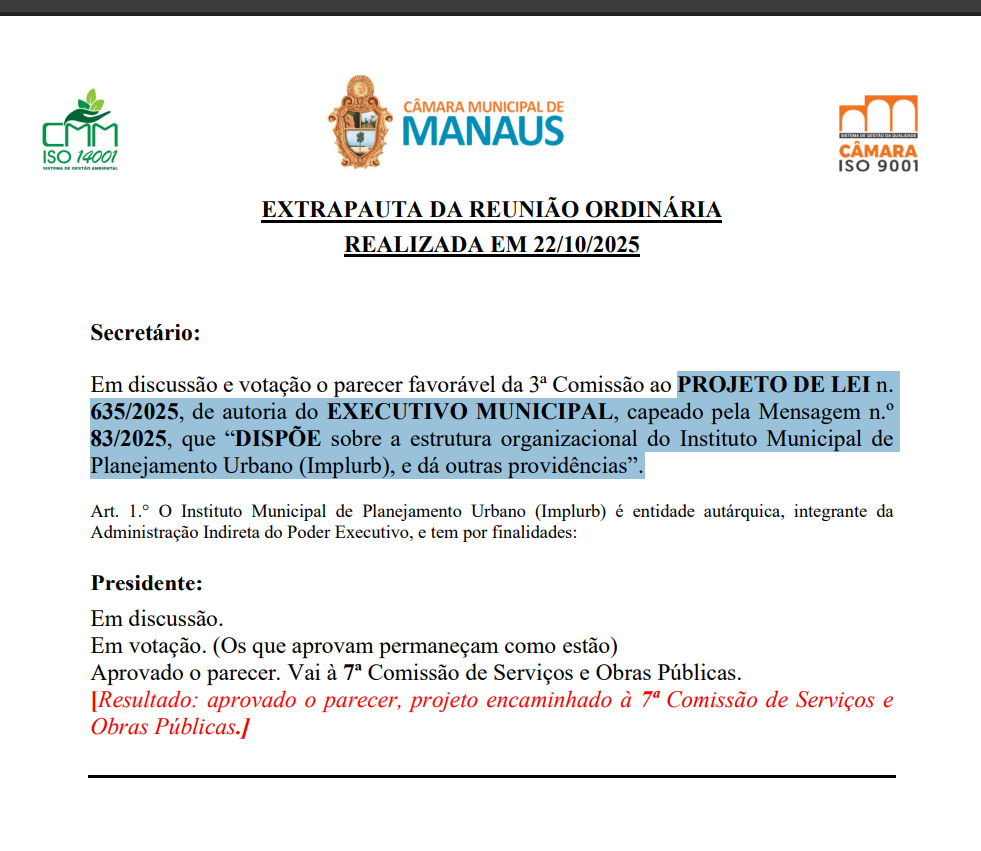 Ao todo, foram votados 27 projetos de lei — 26 pertencentes à pauta ordinária e 1 de autoria do Executivo Municipal. Este último foi o Projeto de Lei nº 635/2025, encaminhado por meio da Mensagem nº 83/2025, que “dispõe sobre a estrutura organizacional do Instituto Municipal de Planejamento Urbano (Implurb)”.