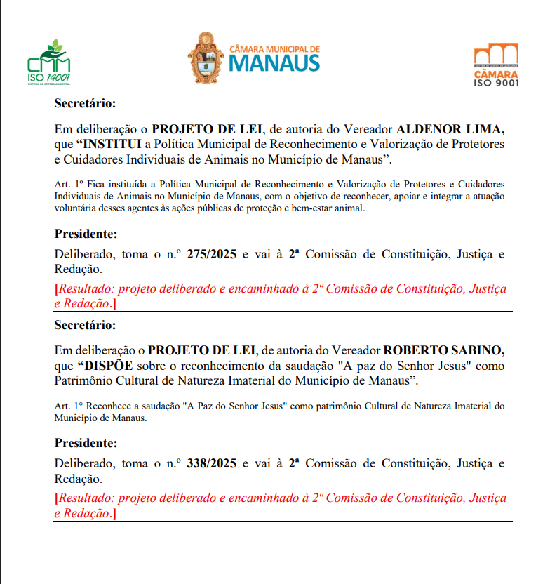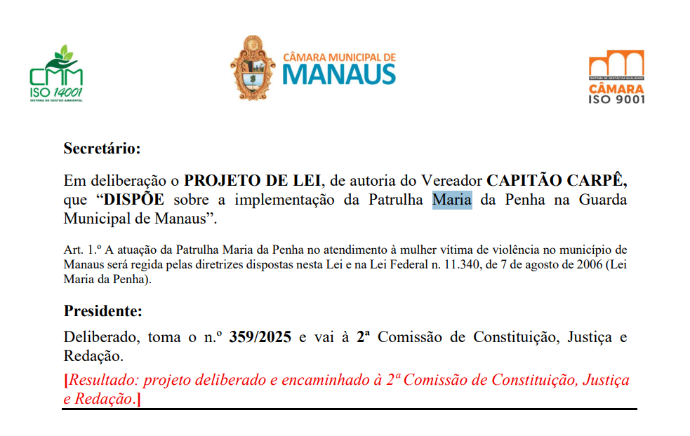 Outro projeto importante aprovado foi o do vereador Capitão Carpê (PL), que trata da implementação da Patrulha Maria da Penha na Guarda Municipal de Manaus. A proposta busca ampliar a proteção às mulheres vítimas de violência doméstica, por meio de ações preventivas e acompanhamento especializado. O projeto segue agora para análise na 2ª Comissão de Constituição, Justiça e Redação da Casa.