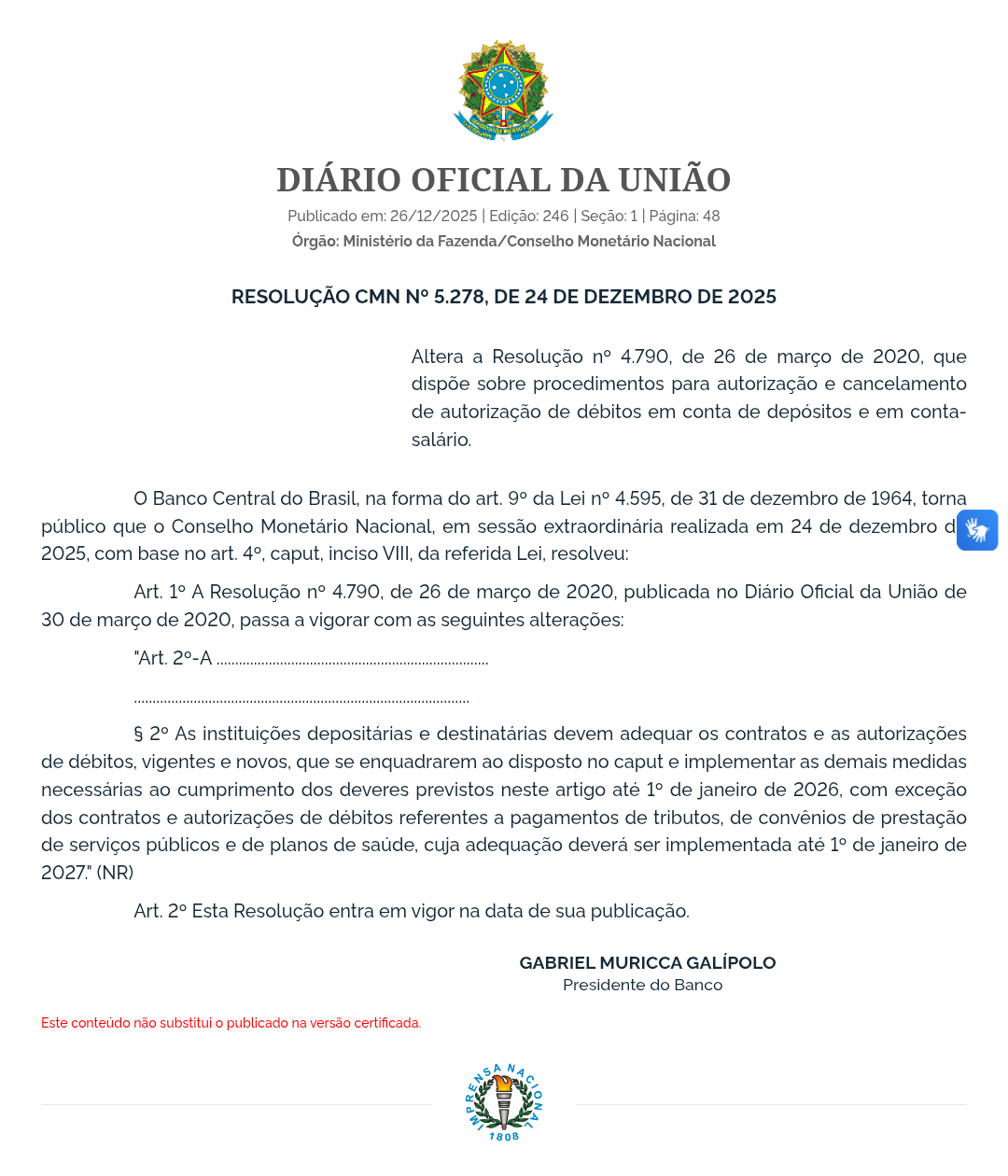 O Conselho Monetário Nacional (CMN) estabeleceu novos prazos para que instituições financeiras ajustem contratos e autorizações de débitos automáticos em contas de depósitos e contas-salário. As mudanças constam na Resolução CMN nº 5.278, publicada no Diário Oficial da União desta sexta-feira (26/12).