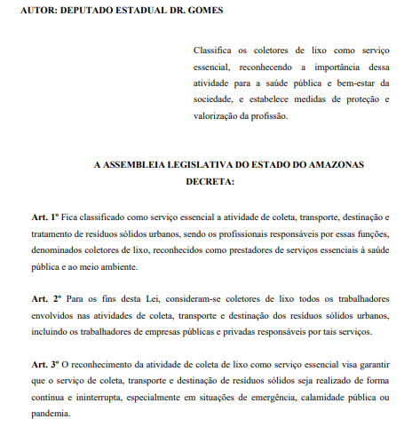 A Assembleia Legislativa do Estado do Amazonas (Aleam) aprovou um projeto de lei de autoria do deputado Dr. Gomes (Podemos) que classifica a atividade de coleta, transporte, destinação e tratamento de resíduos sólidos urbanos como serviço essencial. O texto foi enviado para sanção do governador Wilson Lima (União Brasil).