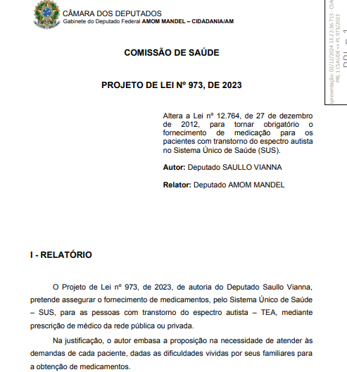 O projeto altera a Política Nacional de Proteção dos Direitos da Pessoa com Transtorno do Espectro Autista, reforçando o acesso ao tratamento medicamentoso dentro dos critérios técnicos definidos pelo Ministério da Saúde.