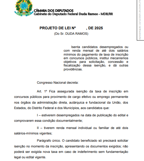 O Projeto de Lei (PL) 6782/25 prevê a isenção da taxa de inscrição em concursos públicos para candidatos desempregados ou com renda mensal de até dois salários mínimos. A proposta está em análise na Câmara dos Deputados.