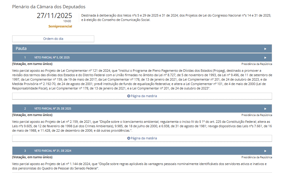 Entre os itens que serão analisados estão os vetos à Lei de Licenciamento Ambiental e ao Programa de Pleno Pagamento de Dívidas dos Estados (Propag), ambos considerados prioritários por diferentes bancadas.