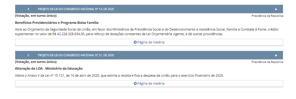 Além dos vetos, os parlamentares também deverão votar dois projetos de lei fundamentais para o Orçamento de 2026. O primeiro é o PLN 14/25, que abre crédito suplementar de R$ 42,2 bilhões para a Seguridade Social, garantindo o pagamento de benefícios previdenciários e do Bolsa Família. O segundo é o PLN 30/25, que amplia os recursos destinados a reajustes salariais e ao provimento de quase 2 mil cargos das forças de segurança do Distrito Federal.