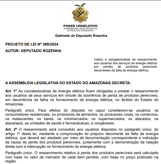 A Assembleia Legislativa do Estado do Amazonas (Aleam) aprovou nesta semana o projeto de lei de autoria do deputado estadual Rozenha (PMB) que obriga as concessionárias de energia elétrica a ressarcirem consumidores por perdas de produtos perecíveis decorrentes de falhas no fornecimento de energia. O texto seguiu para sanção do governador do Amazonas (Aleam).
