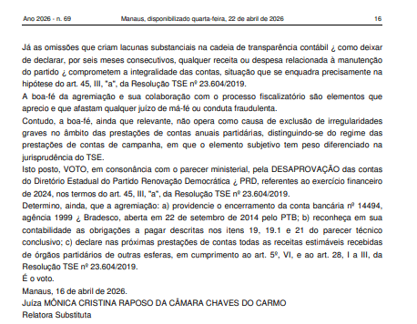 O Tribunal Regional Eleitoral do Amazonas (TRE-AM) decidiu, por unanimidade, desaprovar as contas do Diretório Estadual do Partido Renovação Democrática (PRD) referentes ao exercício financeiro de 2024. A Corte entendeu que houve irregularidades graves na prestação, comprometendo a confiabilidade das informações apresentadas pela legenda.
