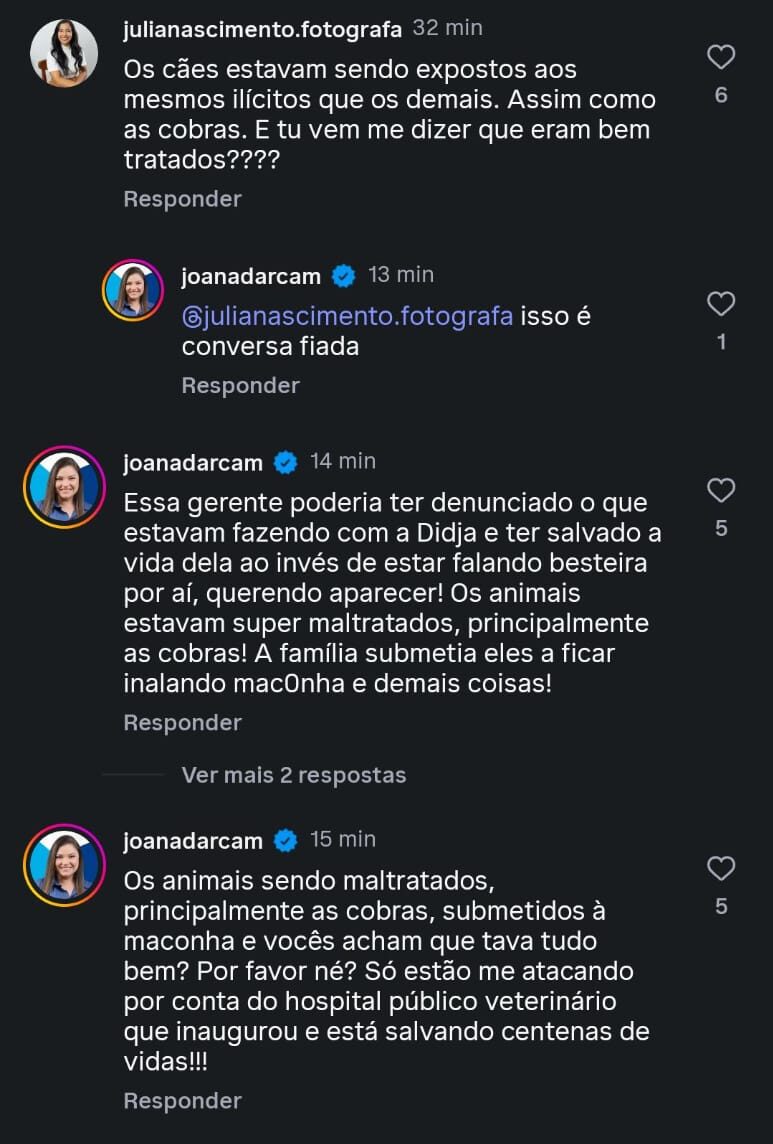 Em nota enviada à Rede Onda Digital, a secretária de Proteção Animal informou que, à época, foi acionada pela Delegacia Especializada em Crimes contra o Meio Ambiente (Dema) para auxiliar no resgate das cobras e cachorros da família Cardoso. Joana ainda informa que vai denunciar a ex-gerente do salão de beleza da família Cardoso por difamação e fake news.