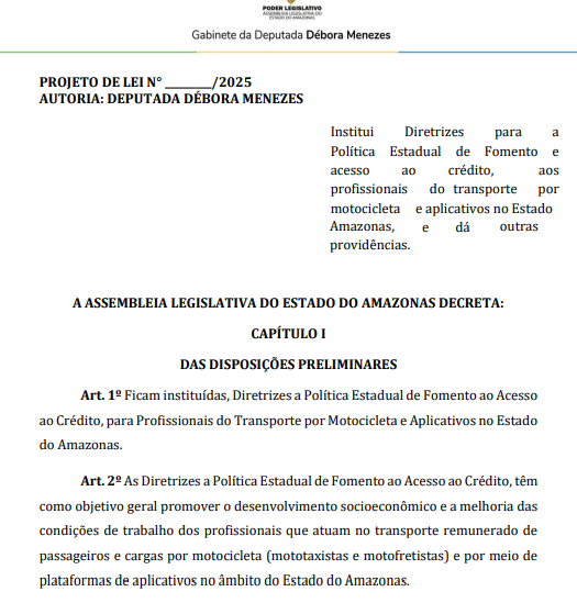 A deputada estadual Débora Menezes (PL) apresentou na Assembleia Legislativa do Amazonas (Aleam) um Projeto de Lei (PL) que cria a Política Estadual de Fomento ao Acesso ao Crédito voltada a profissionais do transporte por motocicleta e por aplicativos no estado. A proposta busca oferecer melhores condições de trabalho e ampliar o acesso a linhas de financiamento específicas para a categoria.