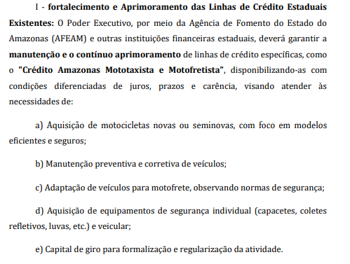 A política deverá ser implementada prioritariamente por meio da Agência de Fomento do Estado do Amazonas (AFEAM), com destaque para o programa “Crédito Amazonas Mototaxista e Motofretista”, que passará a oferecer condições diferenciadas de juros, prazos e carência. Entre as finalidades contempladas estão: