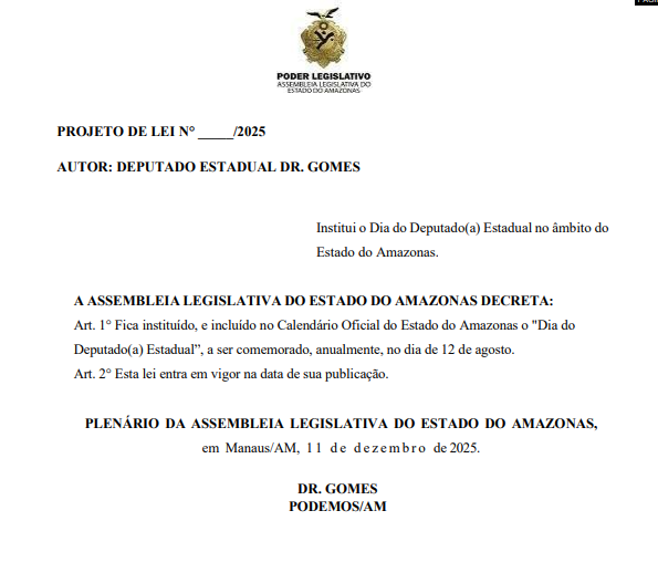 Um projeto de lei (PL) protocolado na Assembleia Legislativa do Amazonas (Aleam) propõe a criação do Dia do Deputado Estadual, a ser comemorado anualmente em 12 de agosto. A matéria é de autoria do deputado estadual Dr. Gomes (Podemos) e inclui a data no Calendário Oficial do Estado.