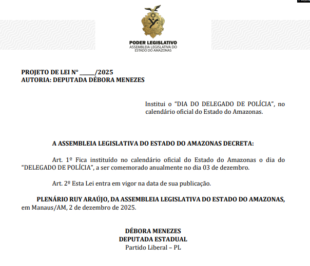Está em tramitação na Assembleia Legislativa do Amazonas (Aleam) o projeto de lei da deputada estadual Débora Menezes (PL) que institui oficialmente o “Dia do Delegado de Polícia”, a ser comemorado anualmente em 3 de dezembro. A proposta inclui a data no calendário oficial do Estado e busca ampliar o reconhecimento social e institucional desses profissionais que atuam na linha de frente da segurança pública.