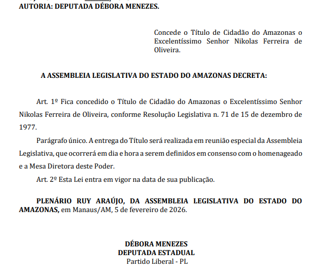 Um projeto de lei de autoria da deputada estadual Débora Menezes (PL) propõe a concessão do Título de Cidadão do Amazonas ao deputado federal Nikolas Ferreira de Oliveira. A matéria tramita na Assembleia Legislativa do Amazonas (Aleam) e segue os critérios previstos na Resolução Legislativa nº 71, de 15 de dezembro de 1977, que regulamenta a outorga da honraria.