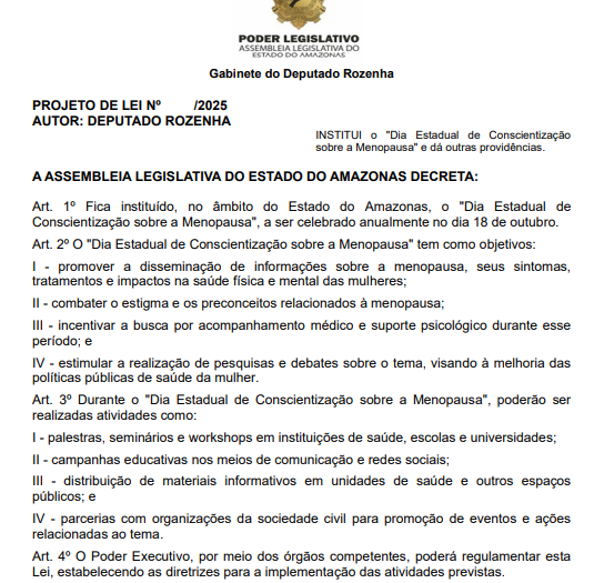 A Assembleia Legislativa do Amazonas (Aleam) aprovou o projeto de lei (PL) que institui o Dia Estadual de Conscientização sobre a Menopausa, a ser celebrado anualmente em 18 de outubro. De autoria do deputado estadual Rozenha (Democrata), a proposta segue agora para sanção governamental.