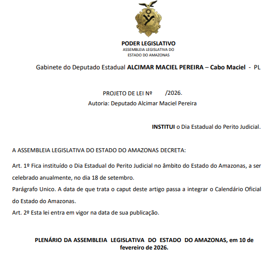 O deputado estadual Alcimar Maciel Pereira, mais conhecido como Cabo Maciel (PL), apresentou na Assembleia Legislativa do Estado do Amazonas (Aleam) um projeto de lei que institui o Dia Estadual do Perito Judicial, a ser celebrado anualmente em 18 de setembro. De acordo com a proposta, a data passará a integrar o Calendário Oficial do Estado do Amazonas.